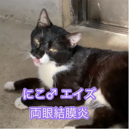 ●にこ♂ エイズ陽性。眩しそうに目を閉じて、少し腫れているように見えたので、眼圧を測ってくれる動物病院で診てもらいました。幸い眼圧は正常で、結膜炎だけでした。抗炎症剤の目薬を1日4回、抗生剤の目薬を1日3回つけて、結膜炎もきれいに治りました。血液検査もほぼ異常なしでした。