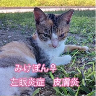 ●みけぽん♀目に炎症があり、背中の後ろの方には皮膚炎が広がっていて受診。抗生剤で皮膚炎は良くなっているようですが、さわれない猫なので、目薬がつけられず、まだ目は治っていません。