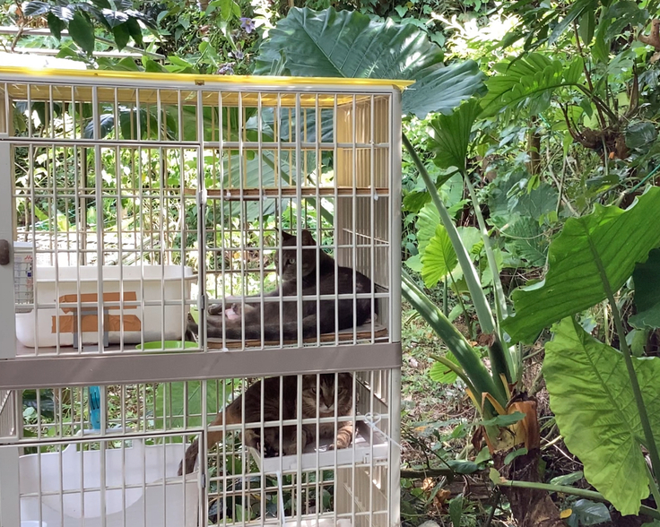 現在は、トタン屋根の下の猫たちは、クーラーのある病猫部屋に避難していますが、満員すぎて掃除ができないので、掃除の間、一部の猫たちのケージを木陰に移動しています。