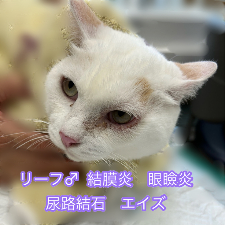 ●リーフ 長いこと眼瞼炎も治らず、受診すると結膜炎もあり、目薬を2種類処方されました。結石のできやすい体質でフード療法食です。エイズもあり、腎臓なども心配だったので血液検査してもらいました。幸い、ほぼ正常でした。