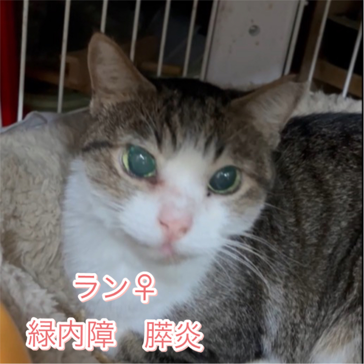 ●ラン 眼球が膨張してくるので、眼圧を下げる目薬をつづけています。以前はひどい歯肉炎でしたが、全抜歯してから歯の痛みから解放されて食欲旺盛ですが、膵炎もあり、時々吐いてしまいます。丸い形のカリカリは食べることもありますが、いつもはふやかしたドライフードに黒缶を混ぜています。