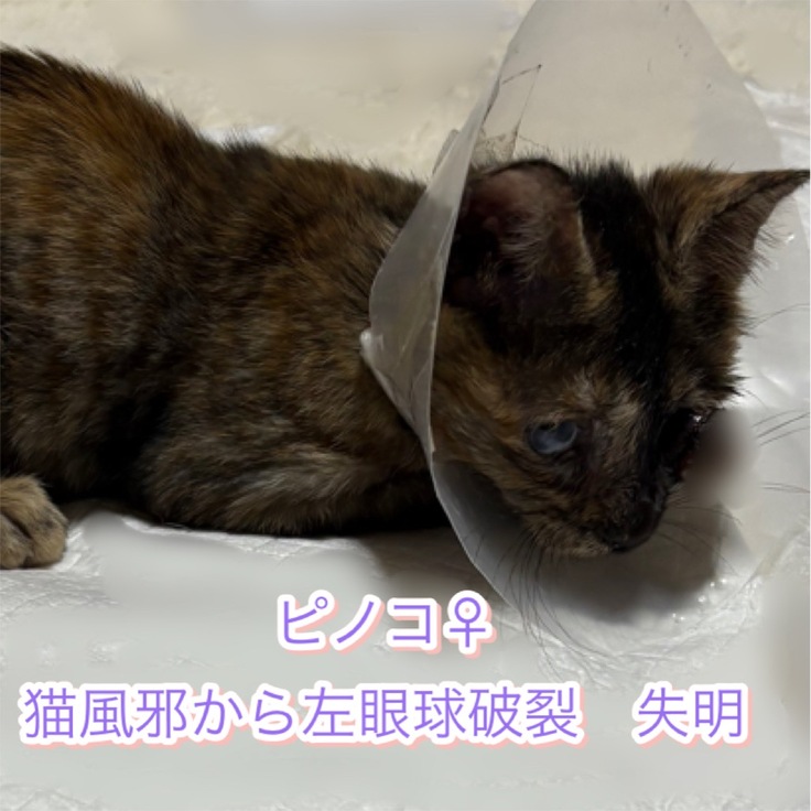 ⚫︎ピノコ♀ 8月初め猫風邪で保護。目ヤニで塞がった眼は、左眼は破裂してしまい、右眼は結膜が癒着して、わずかに瞳孔反射あるものの、見えていないままで、見えるようになるかどうか、わかりません。それでも順調に体重は増えて、元気にしています。
