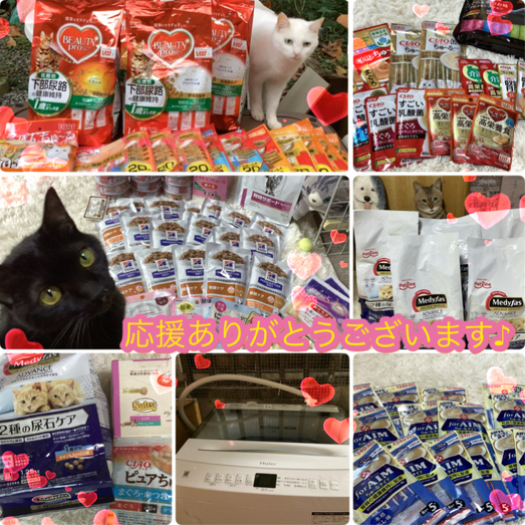 また、猫たちへのフードやおやつ、猫砂など送ってくださった皆様、ありがとうございました。美味しいフードで猫たちも幸せそうです。