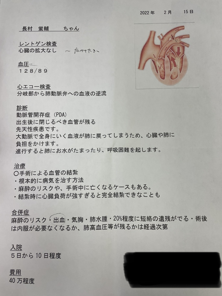 もしかしたら一生心臓の薬を飲んで生きていかなければならいなど、治療費以外でも出費が重なるのは当たり前の事ですし、勿論覚悟の上ですが、せめて手術費用だけでもご支援願えないかと思っております。