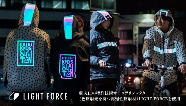 「反射材」オーロラリフレクター(虹色反射光を持つ再帰性反射材)を利用し、