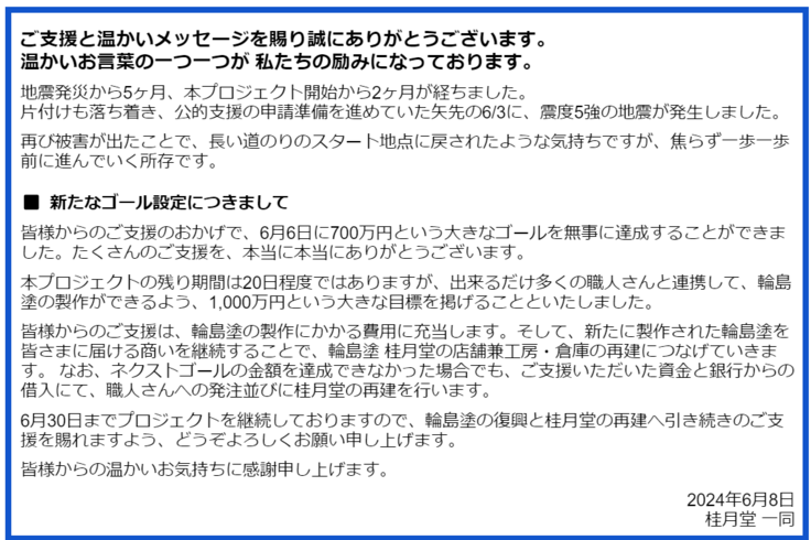 今後とも、輪島塗の復興と桂月堂の再建へ応援を賜れますよう、どうぞよろしくお願い申し上げます。