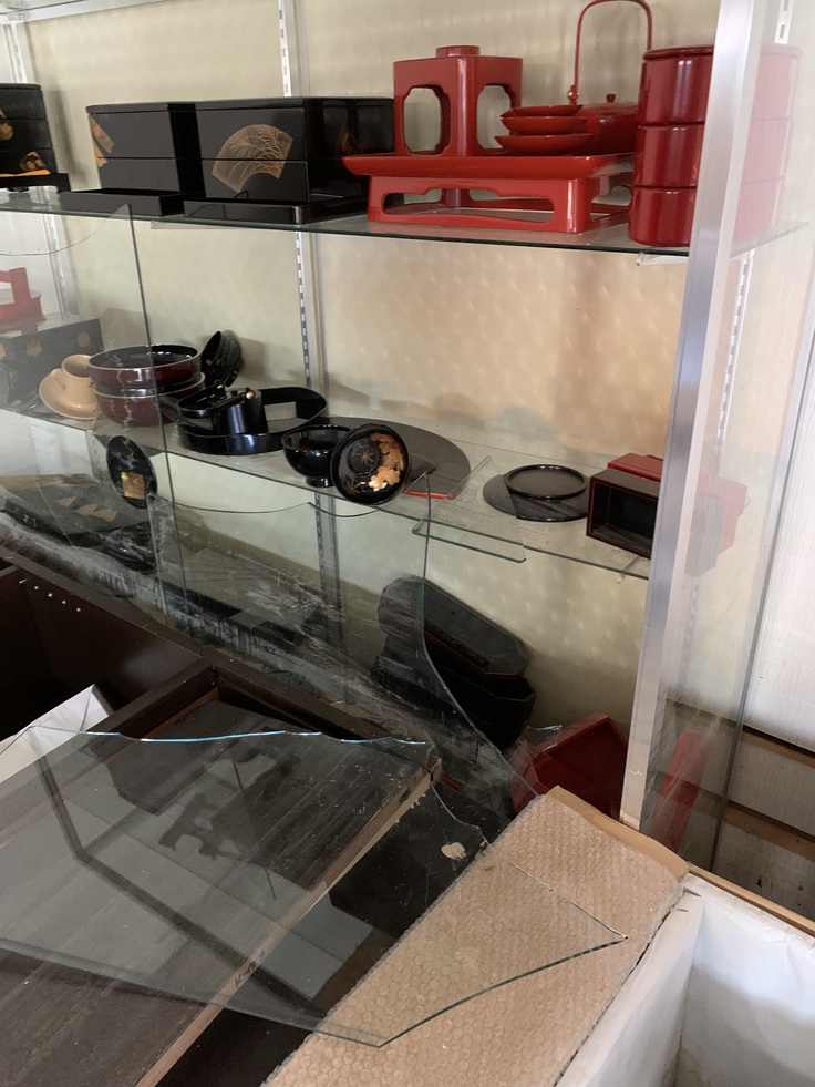 ガラスケースの扉は割れて、陳列していた商品に飛び散っていました。