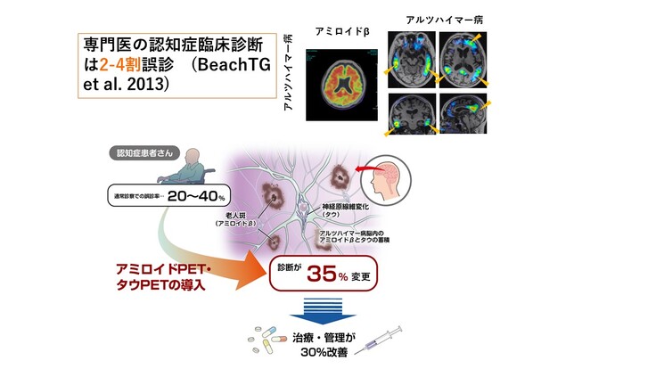 アミロイドPET検査(注5)とタウPET検査の併用により診断、治療、その後の管理が大きく改善されることを明らかとしました。これまでの通常診察、検査では、認知症の診断は2〜4割が誤診であると報告されていました。今回二つのPET検査施行後、認知症診断が約35%、治療や管理も約30%変更されたことがわかりました。したがってPET検査を施行することで認知症診療が大きく改善する可能性が示唆されました。(https://www.keio.ac.jp/ja/press-releases/2022/10/13/28-132648/)