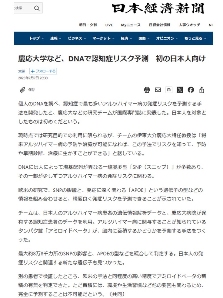 アルツハイマー病、DNAで発症リスク予測 慶大など