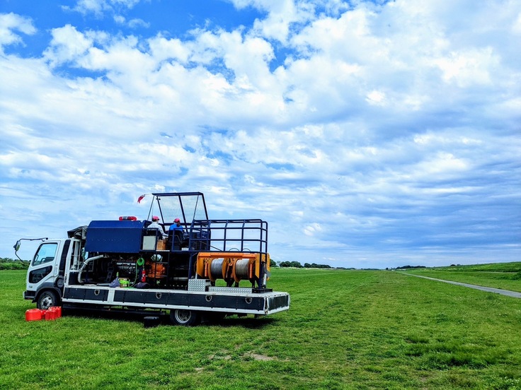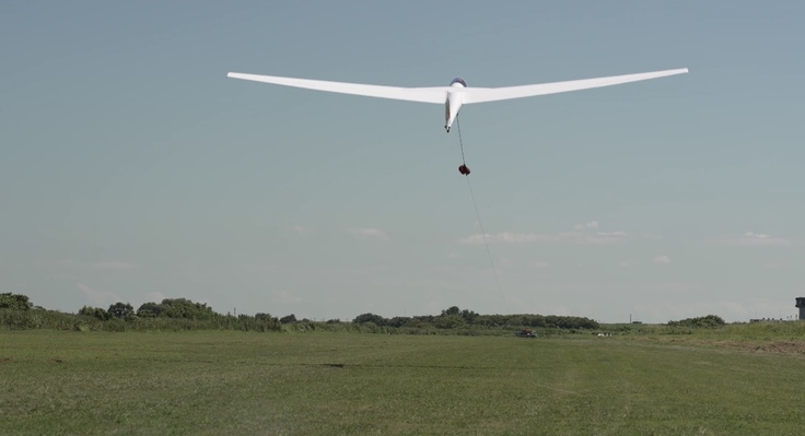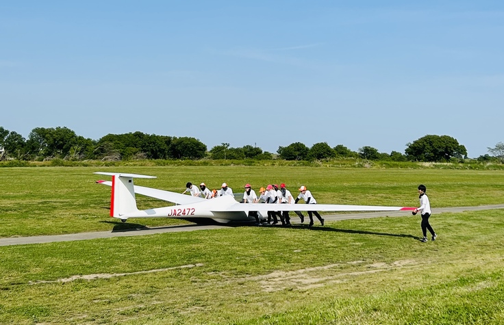 ▲ グライダーはエンジンがありません。ウィンチと呼ばれる機械で、グライダーに取り付けたワイヤーを凧揚げのように巻き取り、一気に加速させて、上昇させます。