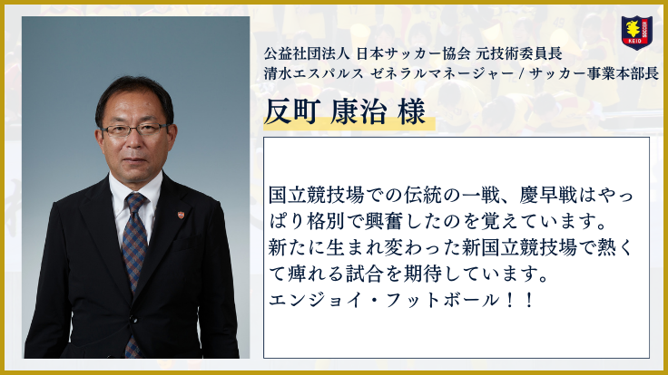 さて、本日は弊部OBである公益社団法人 日本サッカー協会 元技術委員長 / 清水エスパルス ゼネラルマネージャーサッカー事業本部長 反町 康治様より、慶早戦およびクラウドファンディングに対する応援メッセージを頂戴いたしましたので、ご紹介させていただきます。