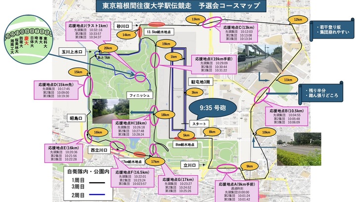 慶應義塾體育會競走部は部として集団応援を実施予定です。添付の地図上に表示されております各地点の周辺にお越しいただければ、慶應の部員が応援しております。各地点の予想通過時刻も地図上に掲載しておりますので、ご参照ください。
