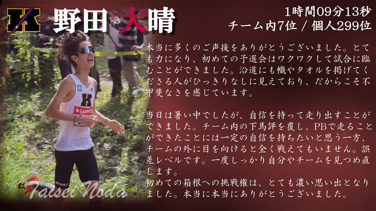 299位 野田 大晴(経2・慶應湘南藤沢)1:09:13 PB