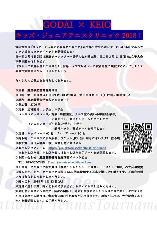 【GODAI×KEIO キッズ・ジュニアテニスクリニック 開催決定!!】