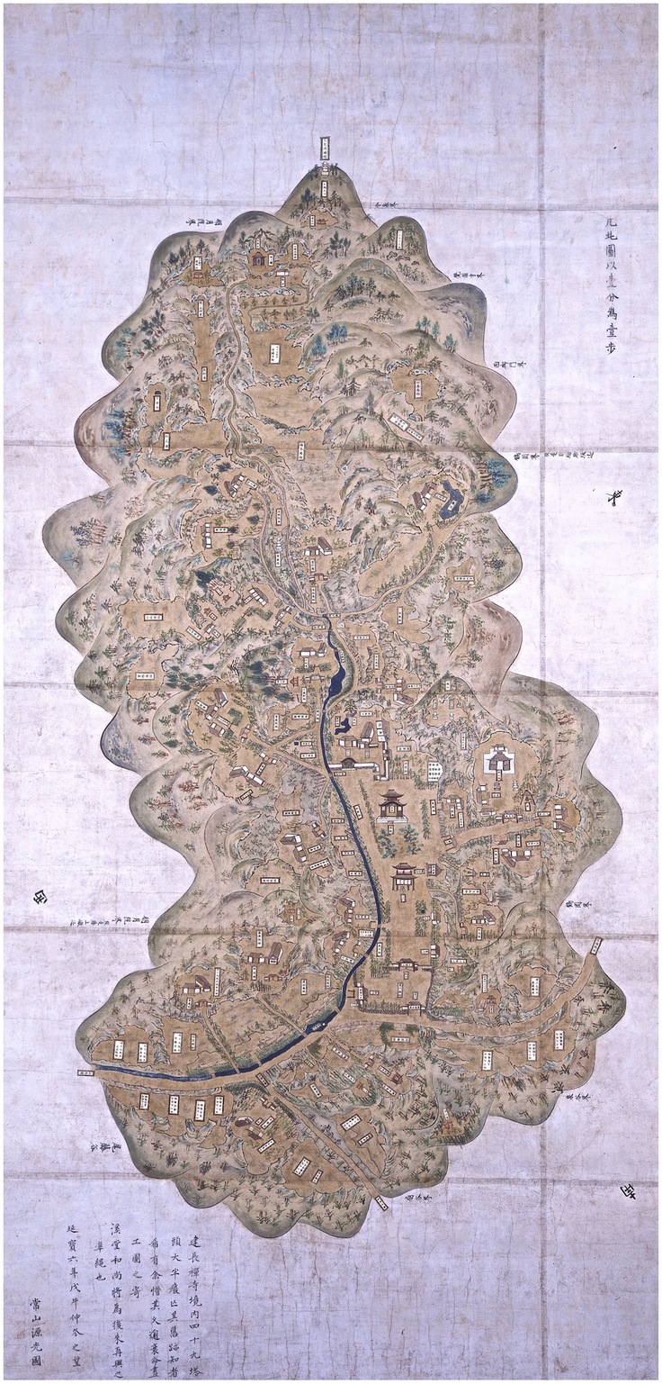 ※ 建長寺の歴史的背景を知る重要な手がかりとして、「建長寺延宝境内絵図」があります。これは延宝6年(1,678年)に、水戸黄門で知られる水戸光圀が、鎌倉時代より長い年月を経て荒廃した建長寺の復興を願い奉納したと伝えられており、四十九院の塔頭をかかえる盛時の姿を伝える重要な資料であります。