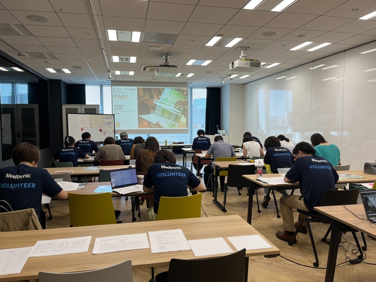 高層ビルの立ち並ぶ品川、「日本メドトロニック」社様で11日火曜日、ユニバーサル絵本作りをしました。