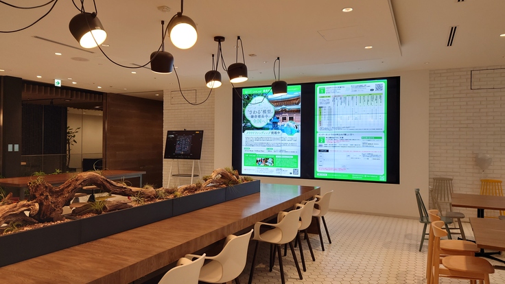 予定の2時間を過ぎ、カフェテリアに移動してビックリ!大スクリーンにさわる模型プロジェクトのチラシが映し出されていて感動します、ウツクシイ!