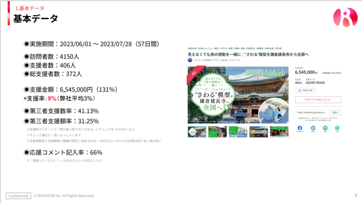ページを訪れた人が支援くださる比率が9%で、RF社平均の3倍以上。これはプロジェクトが届いたことで支援しようと思ってくれた人が多く、共感される、応援されるべきプロジェクトだったということ。