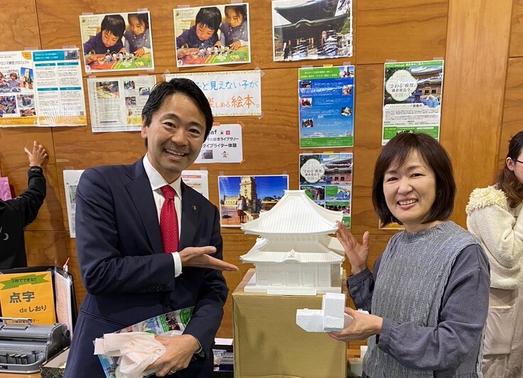 模型になる仏殿にも使われている、くぎを1本も使わない日本の伝統木造建築技術(「木組み博物館」にて体験、カバー写真)に感動し、自分で組める簡単な模型を作って初公開。古の大工さんの息吹が感じられる匠の技、いつか木で作り”さわる”模型の傍らに備えたい・・お立ち寄りくださった松尾市長にもご紹介し、ご一緒にパチリ。
