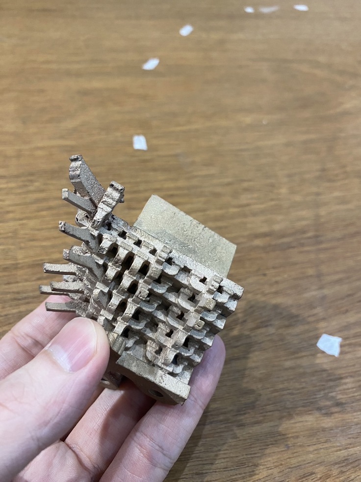 組み物の最終のブロンズサンプルの様子では、もろもろ取り付けの穴などを入れたことで真空鋳造が難しくなり、一般的な鋳造にすると空気が入りやすくなるのだとか。当初の試作より少し精度が落ちるかもしれないとのことですが、最終的に必要なら少し手で削るなどの対応も考えてくださっているようです。