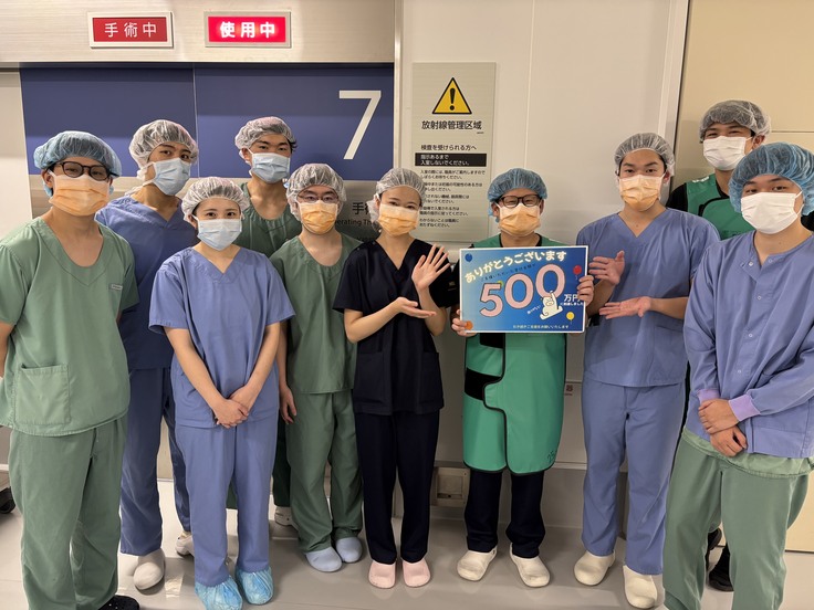 写真は、構造的心疾患(弁膜症など)のカテーテル治療を行うハートチームでの1枚です。手術の合間にパシャリ!