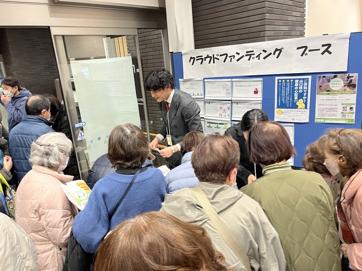 講演後には、玉木病院、都志見病院、萩市民病院、当院から参加いただいた多職種のチームで脳卒中予防を学ぶブースを出展しました。この中にクラウドファンディングのブースも設けさせていただきました。こちらの不手際で大行列となってしまい、長くお待たせしてしまいましたが、根気強くお待ちいただきご支援いただいたみなさま、誠にありがとうございました。75名もの方々からご支援を賜りました。脳神経外科の金谷先生も受付を手伝ってくれました。ありがとう!
