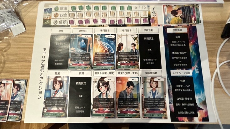 このゲームは、カードを1枚ずつ引きながら、自分のボードへ配置し、みずから臨床検査技師としてのキャリア形成を行う戦略ゲームです。デモプレイでも色々な職業や専門性を持ち、ゲームの目的にもなっている、健康ストーン、お金ストーン、信頼ストーンを集めをすることを楽しみながら行うことができました。