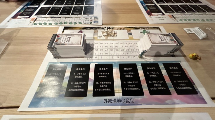 今回は、東京で集まれるメンバー3人でゲームを実施、10年間、20年間、30年間、20年間と計4回行い、ルールの確認やカードの効果が妥当か、ストーンの数など、色々と意見交換をしながら行いました。
