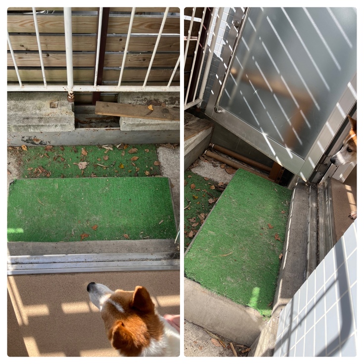 中型犬の子がお散歩に出る際に使う出入り口ですが、段差が急な階段となっており、足腰の弱いシニアや目の不自由な子にとっては出入りが不便な状態となっております。