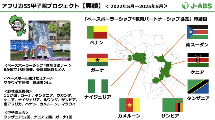 アフリカの学校に、日本型野球指導法「ベースボーラーシップⓇ教育」を紹介、普及していくプロジェクトです。アフリカ55の国・地域に25年かけて展開していきます。2025年5月現在、アフリカ8カ国の野球連盟と協定を締結しました。