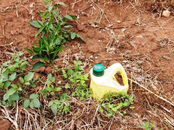 乾燥の激しいこの地域では、苗木を植えた後の定着率が低いことが大きな問題です。乾季の幼木が枯れないように、使用後の油の容器などの10-15Lのプラスティック容器の底に3・4個穴を空けて、土の中に埋めてしまい、乾季に7~10日ごとに水を与えるというものです。同じ方法で成木にも80cmくらい離して使うことができます。