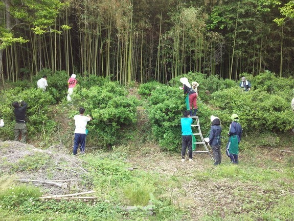 (昨年の茶摘みの様子。長年摘まれていなかった古いお茶の木を再生しました。)