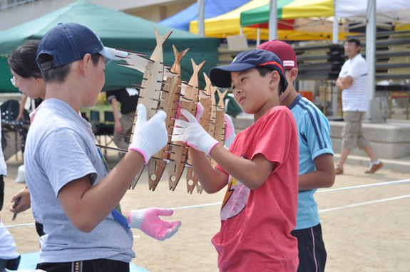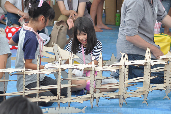 気仙沼小学校、南気仙沼小学校の6年生62人とサカナのアーチを作り終えました。
