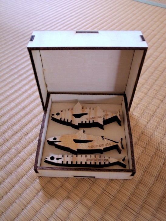 木材をレーザーカットして作る、気仙沼を代表する魚(さんま、かつお、さめ)の形をしたキーホールダー3つをセットでプレゼント。