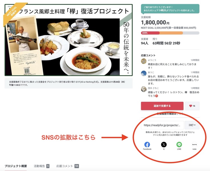 SNSの拡散は、本プロジェクト画面から行うことができます。