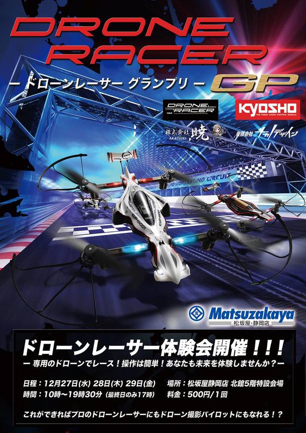 12月27日(木)〜29日(金)の三日間、松坂屋静岡店の北館5F特設会場にて開催されるKYOSHOドローンレーサーの体
