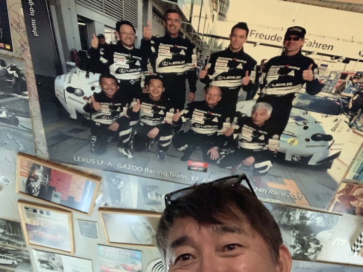 ですから、そこで僕の写真を発見したときは嬉しかったですね。天井にドカンと・・・。レクサスLFAで挑戦したときの集合写真です。トヨタ自動車の豊田章男社長とチームメイトでしたね。