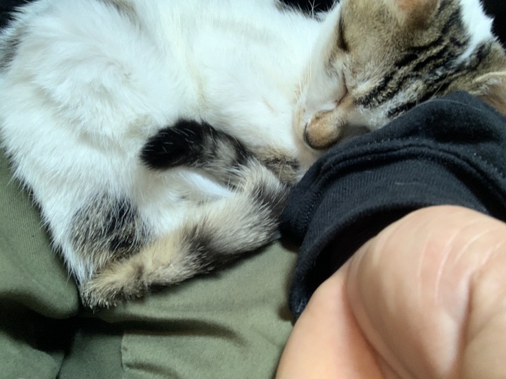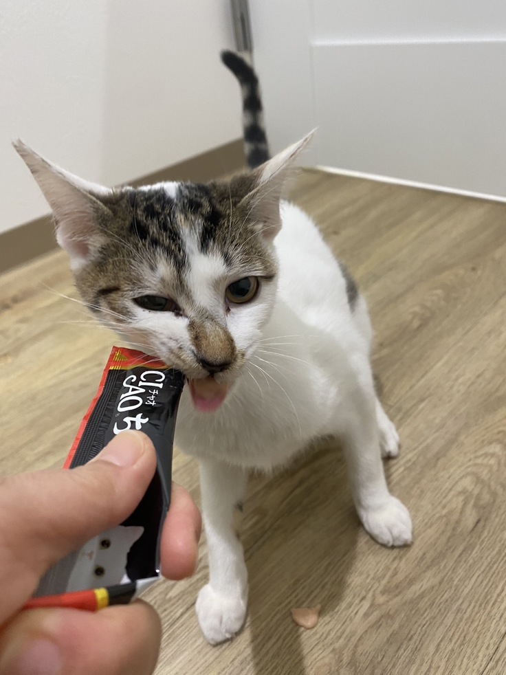 ご紹介させていただいた通り元々少食ですので、少し調子が悪いのかなと思い、チュールをあげましたが、少しだけペロペロとしただけで膝の上で眠ってしまいました。
