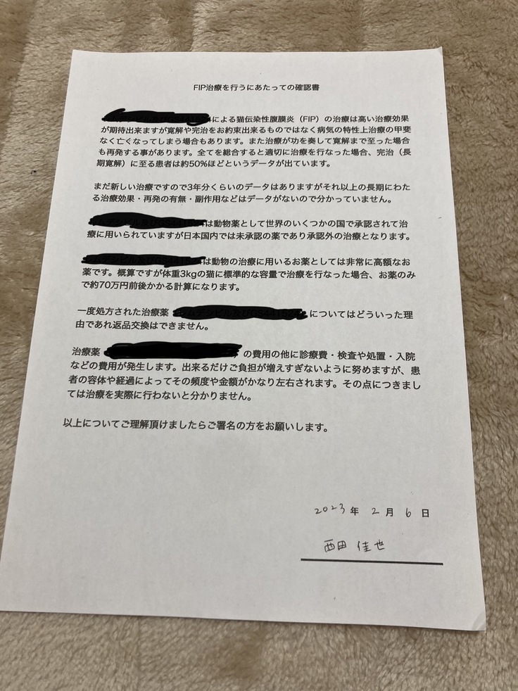 現在治療して頂いている動物病院様からも正式にFIPという診断書を出して頂きました。