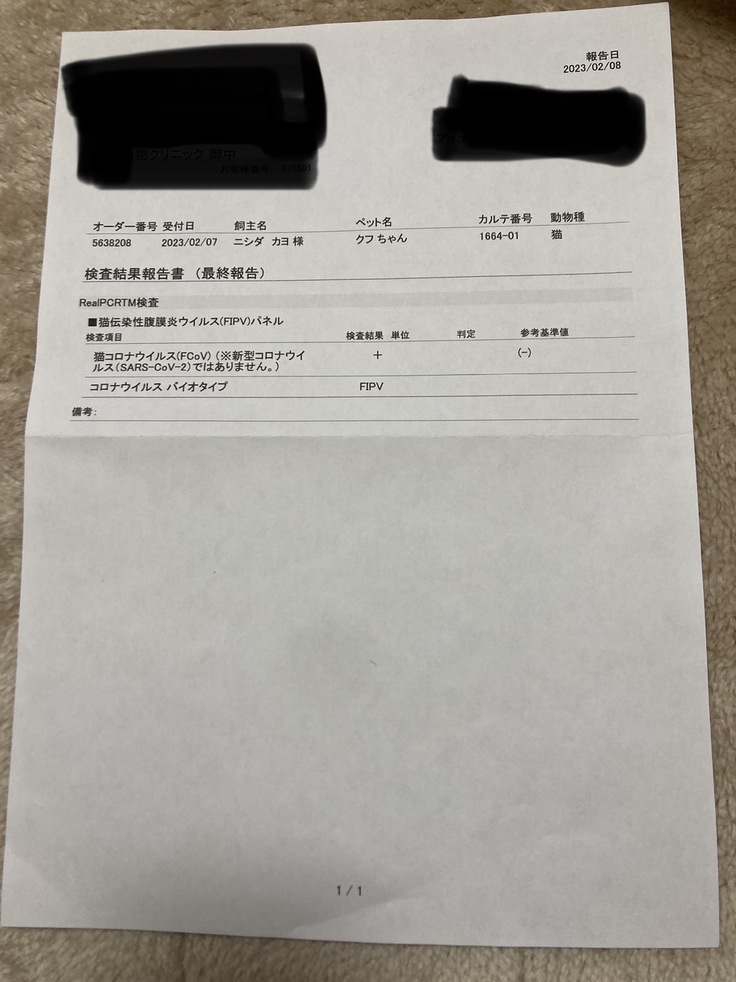 結果はやはりFIPでした。わかっていたもののやはりショックでした。