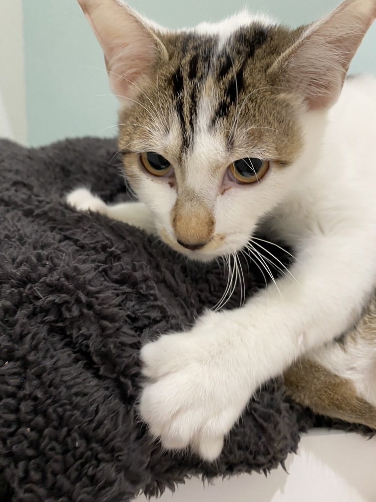 クフとの出会いは2022年12月初旬に保護猫の譲渡会で出会いました。その時生後4ヶ月で、初めの印象は顔が小さくて男前だなと感じました。