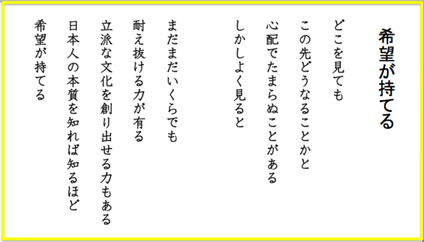 私は、希望をベースにした講演でそのことを皆さんにお伝いしたいとおもっております。まずはこころの詩集「希望」をお読みいただき九州を元気に。日本を元気にしていきたいと願うばかりです。