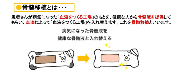 白血球の型が一致するのはきょうだいで四分の一、他人では数百から数万分の一の確率です。きょうだいのドナーがいないときは「骨髄バンク(他人に骨髄液を提供してくれるドナーをあっせんするところ)」からドナーさんを探します。