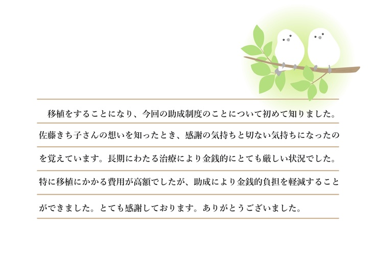 佐藤きち子基金は今後も継続いたします。また、その他の患者支援基金や無料電話相談、そして全国で活動する骨髄バンクボランティアとの骨髄ドナーの登録推進活動などで血液疾患の患者さんやそのご家族の支援に努めてまいりますので引き続き見守っていただけたら幸いです。