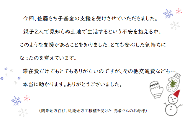 「佐藤きち子記念 造血細胞移植患者支援基金」はこの1月に助成金の累計額が1億円を突破しました。延べ380人を超える患者さんやそのご家族に支援することができました。この基金の運営を支えてくださる支援者の皆さんのおかげと心より感謝しております。