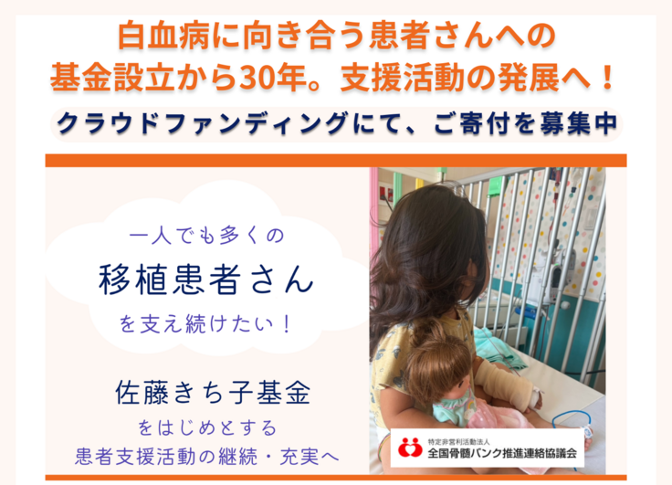 この度、『白血病に向き合う患者さんへの基金設立から30年。支援活動の発展へ!』と題し、クラウドファンディングに再挑戦することになりました。