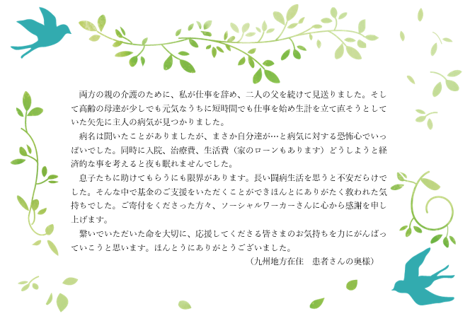 佐藤きち子基金の助成を受けられた患者さんのご家族から送られてきたメッセージを、感謝をこめて支援者の皆さまにお届けします。