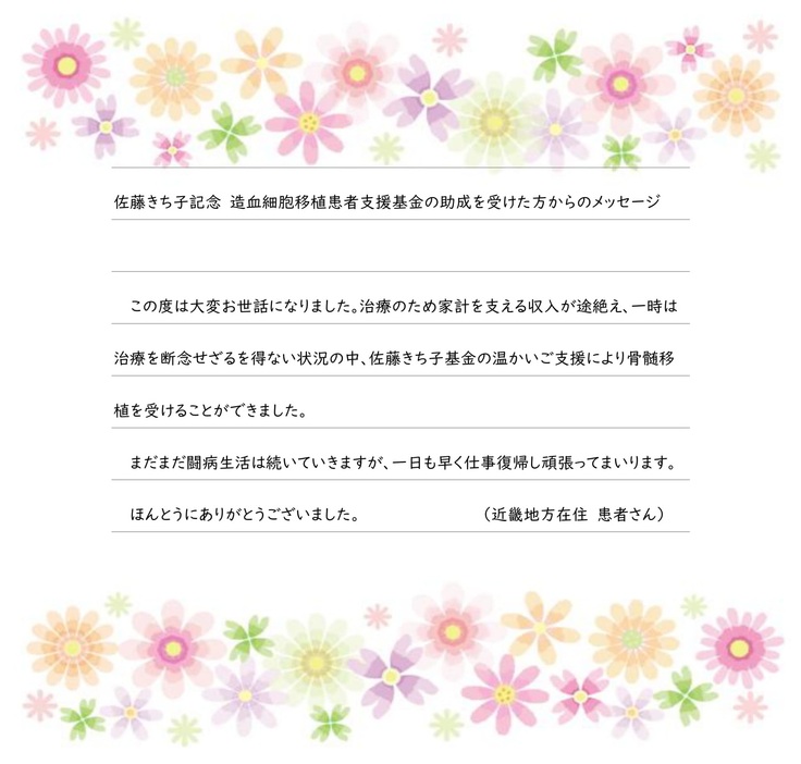 お陰様で目標の300万円を超える、3,301,000円という多額のご寄付をお寄せいただき、クラウドファンディング実行手数料を除く2,683,713円が入金されました。この金額は全額、白血病などの血液難病治療のために移植治療を受けられる患者さん支援のための「佐藤きち子記念 造血細胞移植患者支援基金(佐藤きち子基金)」に繰り入れさせていただきました。