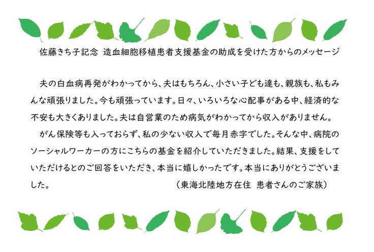 皆様のご協力を得て佐藤きち子基金は継続運営ができています。今後も移植患者さんの支援を行いつつ、基金の継続に注力して参ります。