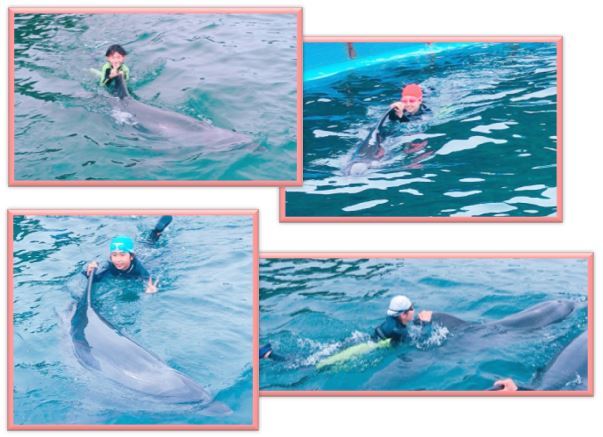 最初は、プールが深くてこわかったけど、練習できて楽しかった。シュノーケルをつけたら200m泳げた。イルカと泳ぐのは、行く前からとても緊張してたし、現地へ行ってもずーっとドキドキしていた。いざやってみると水が冷たくて寒かったけど、イルカにのっているととても楽しかった。ホテルもきれいでステキだったし、楽しかった。いるかツアーにゆきちゃんが来れなかったから、ちょっとさみしかった。はじめは、友だちがいなかったけど、中学生が優しくしてくれて行くのが楽しみになった。とても楽しかったので、来年も行きたい。最高のメンバーでした。みんなと会えて、仲良くできて、遊べて、とてもうれしかった。イルカと泳げて遊べてとてもうれしかった。こわかったけど、のると楽しかった。さわるとこんにゃくみたいにツルツルスベスベだった。クララちゃんが、かわいかった!イルカは泳ぐスピードが、とても速いんだなぁと思いました。夕方の空もとてもきれいでクッキリとした飛行機雲が見えました。夜には、家とかの色々な光がきれいでした。また、見たいです。